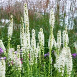 Zauberhaft erblühen die besonderen Blüten der Prachtscharte. Über eine lange Zeit öffnen sich die reinweißen Blüten am Stiel von unten nach oben und erfreuen so mit langer Pracht. Bienen und andere Insekten dient die winterharte Staude als wertvolle Nahrungsquelle im Hochsommer. Mit ihrem aufrechten Wuchs eignet sich die Prachtscharte, die auch Liatris genannt wird, als Mittelpunkt im Staudenbeet. Bis zu 60 cm hoch wird die robuste Schönheit und fügt sich so bestens in gemischte Pflanzungen mit anderen sommerblühenden Stauden ein. Aparte Pflanzungen ergeben sich aus Kombinationen von Prachtscharte mit Gräsern oder Sonnenhut.