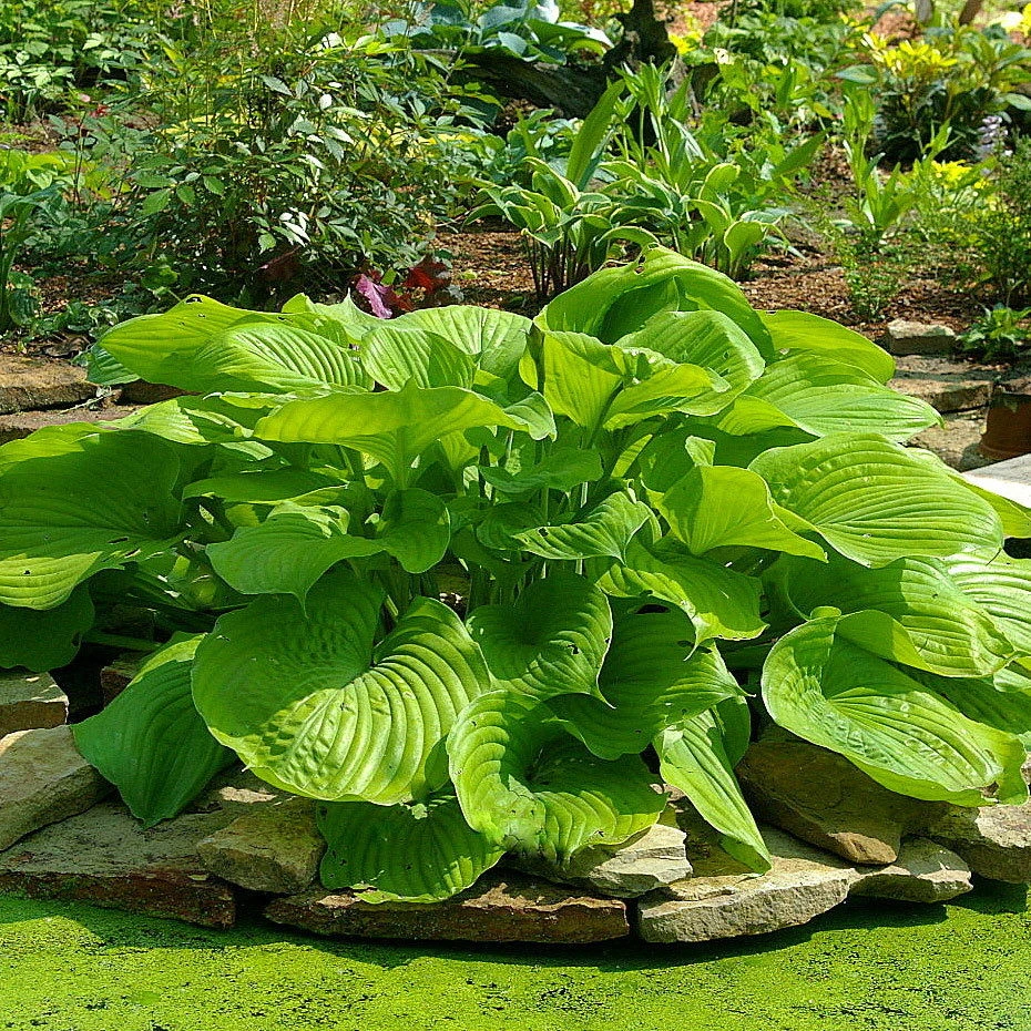 Hosta ‚Sum and Substance‘ ist eine sehr robuste und widerstandsfähige Sorte, die auch mit sonnigen Lagen sehr gut zurecht kommt, je sonniger, desto gelblicher wird das Laub. Ab August erscheinen schöne, hellviolette Blüten über den Blättern.